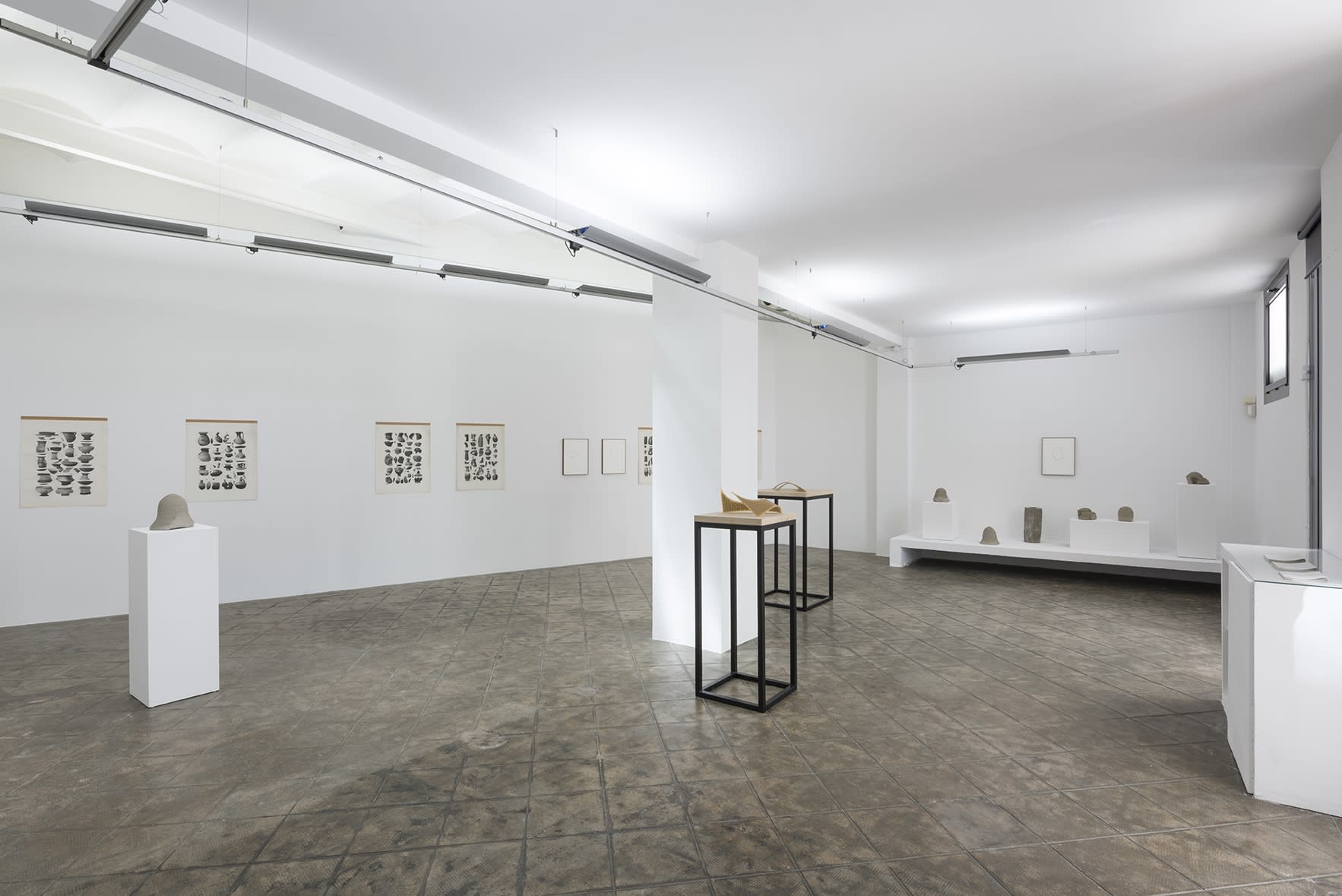 Together with these works on paper some new sculptures titled generically Stilfragen (crania) are presented. They are small pieces made with concrete that can either resemble heads or vases, containers or recipients. Mendizabal has imprinted on their surface the traces of basketry warp. Here again the artist questions the Western historic account of technologies as significant vehicles that have favoured gestures and technical abilities associated to the expression of the individual (carving, cutting, moulding, casting) over the rudimentary weft of flexible fibers, a technique that seems to be rather linked to a social act, a collective knowledge.