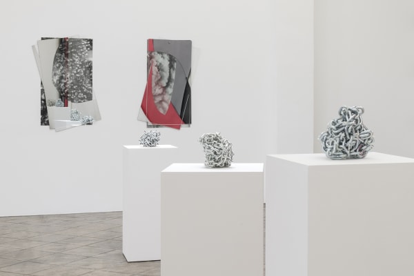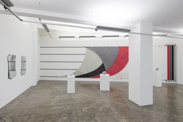 Recognized as one of the most prominent artists on the current Spanish contemporary scene, Asier Mendizabal has developed a remarkable body of work that has focused mainly on the relationships between form, discourse and ideology. The question of the sign and its materiality and identification as a social and political emblem has a place among the artist’s interests. Although abstract sculpture is his most representative medium, his work is resolved through various means and procedures. Collages, installations, flags or banners, photographs and works on paper are an important part of his artistic vocabulary, always with an intuitive sense for the graphic and the sculptural. The artist is the author of many texts that are closely linked to his artistic practice. We begin this synthetic view of Mendizabal's parcours with his current exhibition at ProjecteSD. Sinfines brings together a group of new works in which the ambiguous relationship between fragment and totality, background and figure, sign and meaning, recurring subjects in Mendizabal’s oeuvre, are revisited from a new point of view. Sinfines is the plural of the Spanish word Sinfín which is a colloquial term for the backdrops used in studio photography, but it also means endless and in its plural version, “endlesses”.