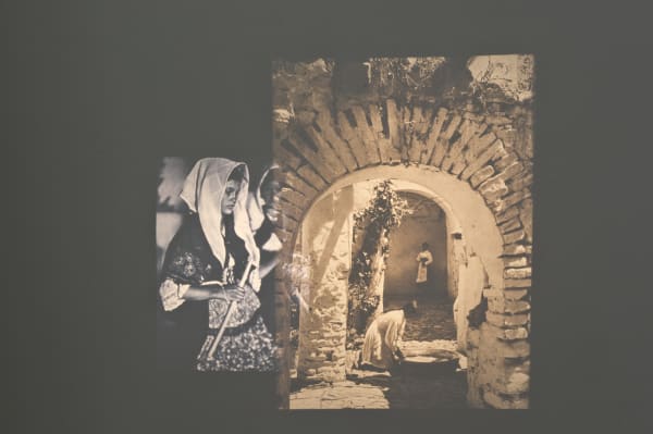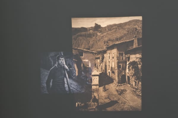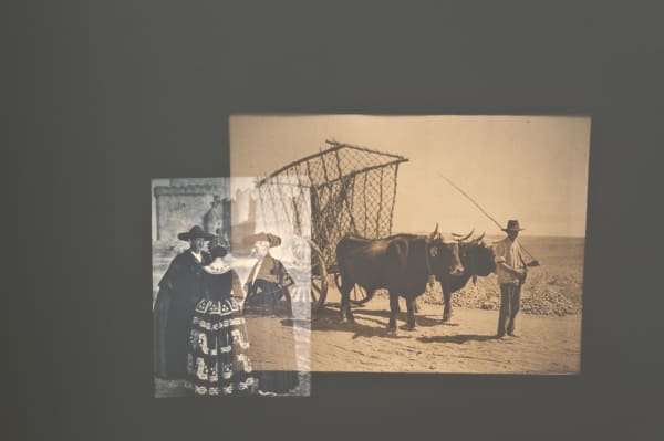 The double projection entitled Das Unbekannte Spanien/España, tipos y trajes is shown consists of a series of slides taken from two photography books, one showing the work of Spanish pictorialist photographer José Ortiz Echagüe and the other the work by German photographer Kurt Hielscher.